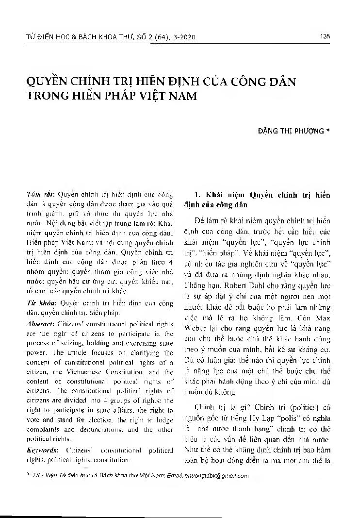 Quyền chính trị hiến định của công dân trong hiến pháp Việt Nam = Citizens'constitutional political rights in consti-tution of Vietnam