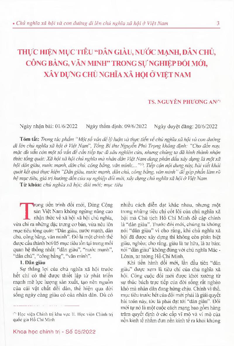 Thực hiện mục tiêu “dân giàu, nước mạnh, dân chủ, công bằng, văn minh” trong sự nghiệp đổi mới, xây dựng chủ nghĩa xã hội ở Việt Nam = Implement the goal of "rich people, strong country, democracy, justice and civilization" in the cause of renovation and