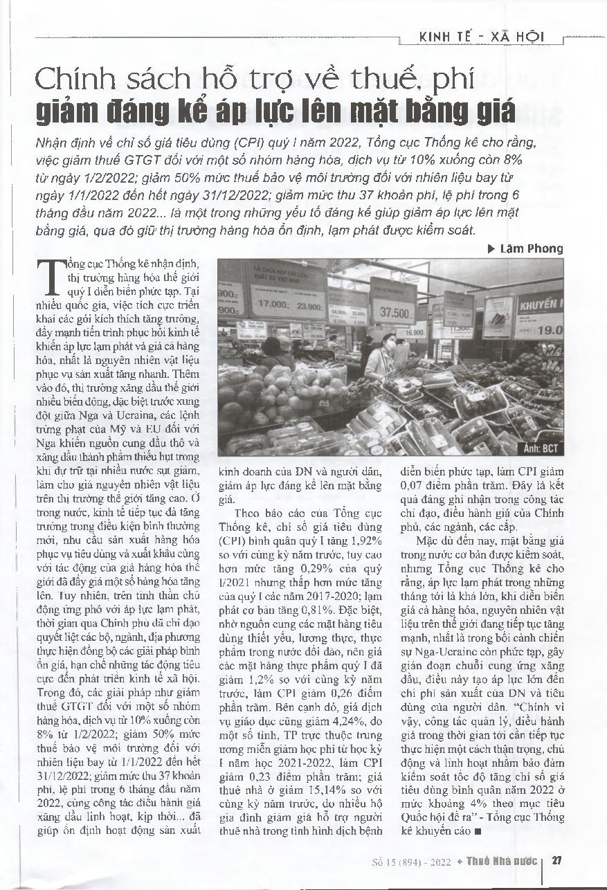 Chính sách hỗ trợ về thuế, phí giảm đáng kể áp lực lên mặt bằng giá = Tax and fee support policies significantly reduce pressure on the price level