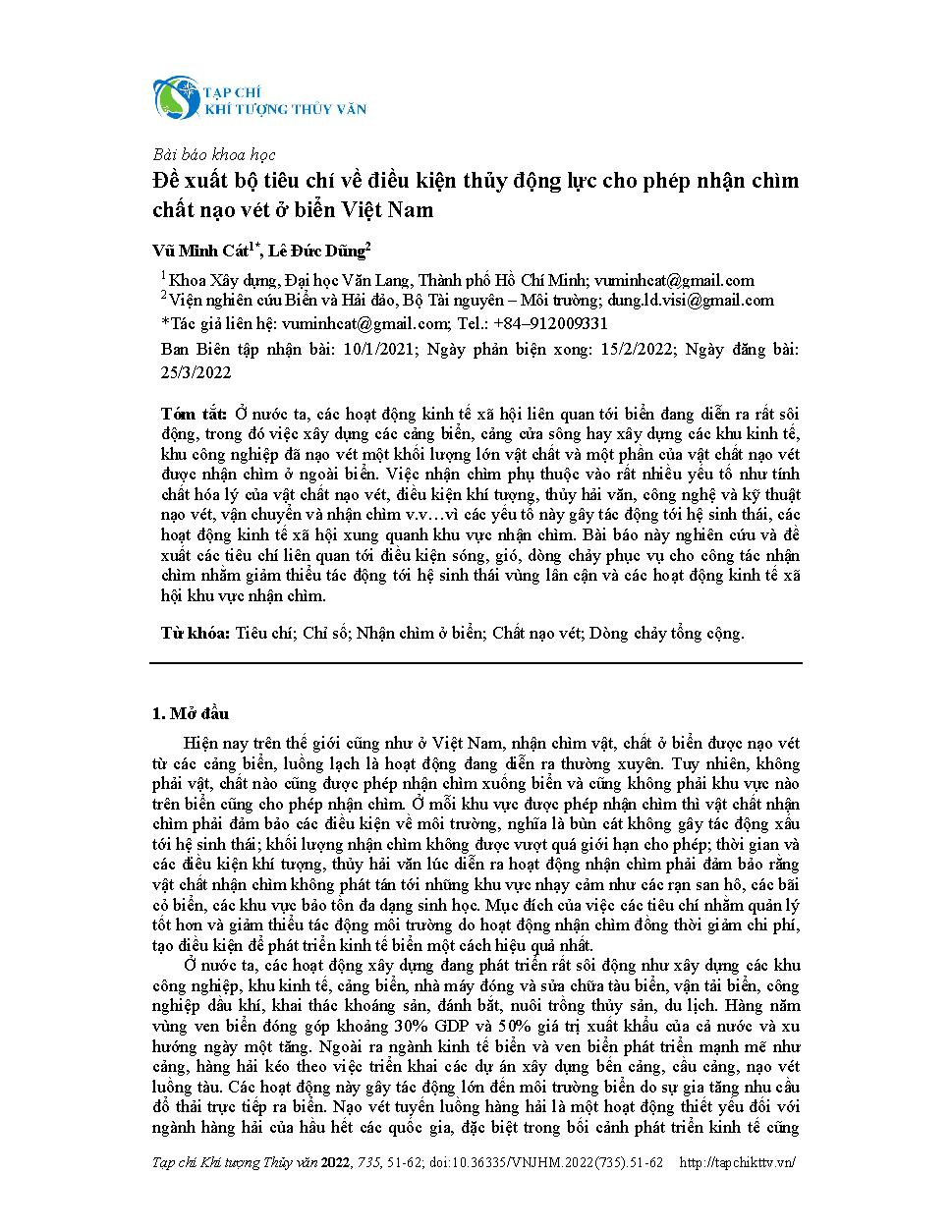 Đề xuất bộ tiêu chí về điều kiện thủy động lực cho phép nhận chìm chất nạo vét ở biển Việt Nam = Proposing a set of criteria on the hydrodynamic conditions to allow dumping the dredged materials in the sea of Vietnam