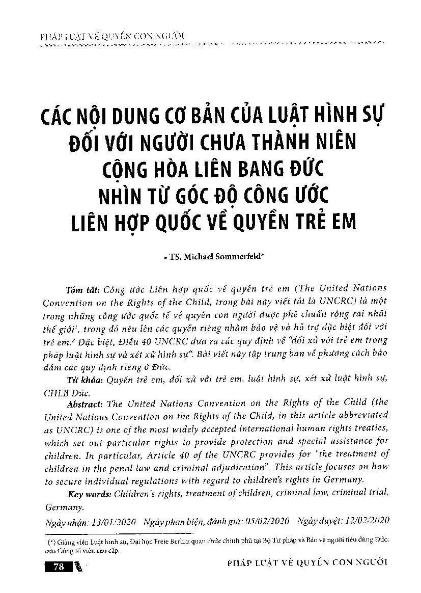 Các nội dung cơ bản của luật hình sự đối với người chưa thành niên ở Cộng hòa Liên bang Đức nhìn từ góc độ Công ước Liên hợp quốc vể quyền trẻ em = Basic contents of criminal law for juvenile person in the Federal Republic of Germany from the perspective of the United Nations Convention on the Rights of the Child