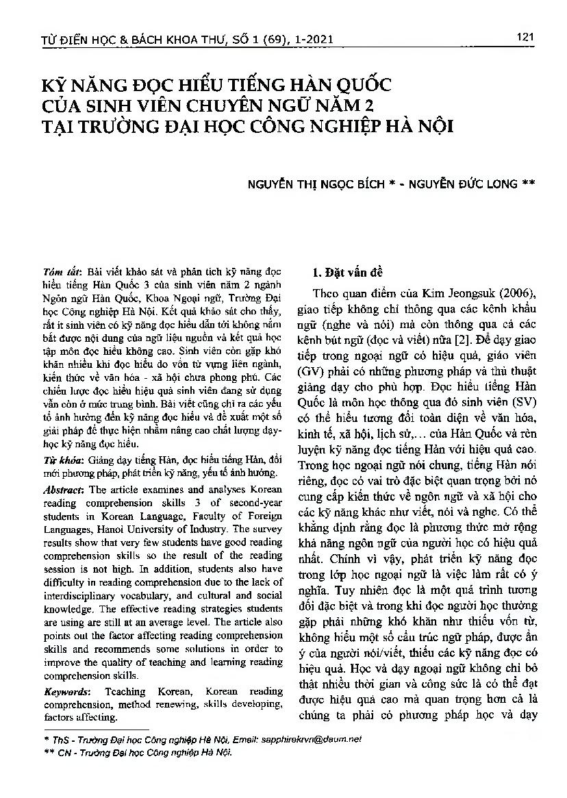 Kỹ năng đọc hiểu tiếng Hàn Quốc của sinh viên chuyên ngữ năm 2 tại trường Đại học Công nghiệp Hà Nội = Korean reading comprehension skills of second- year Korean-majored students at Hanoi University of Industry