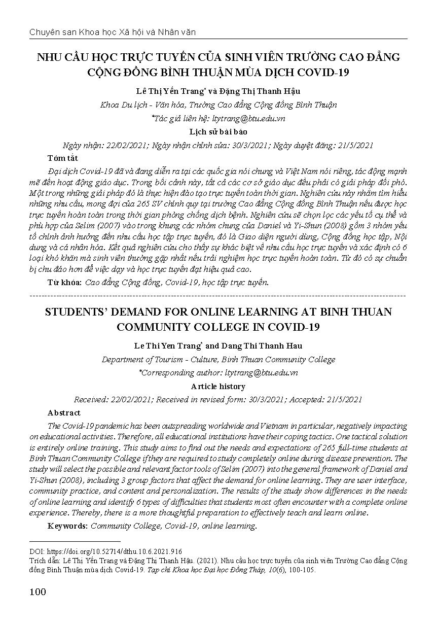 Nhu cầu học trực tuyến của sinh viên Trường Cao đẳng Cộng đồng Bình Thuận mùa dịch Covid-19 = Students’ demand for online learning at Binh Thuan Community College in Covid-19