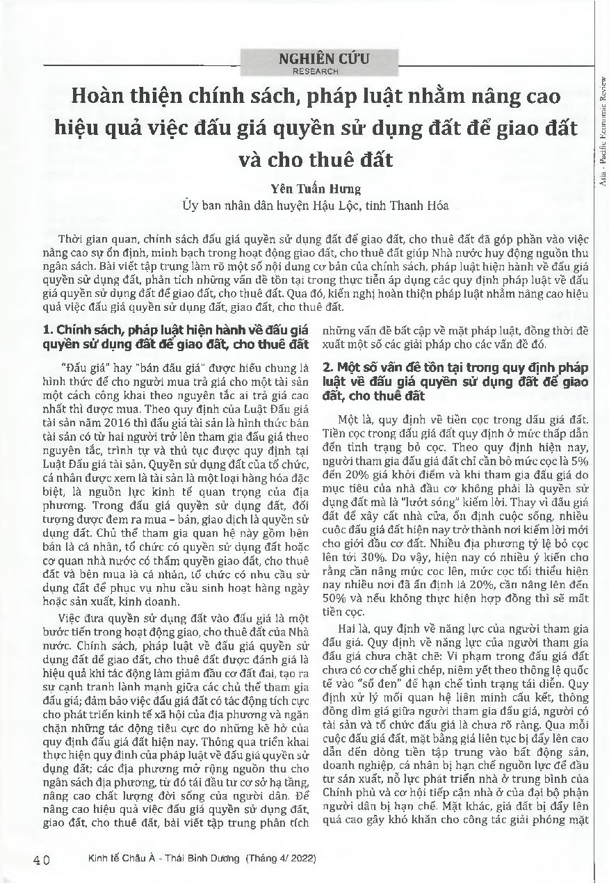 Hoàn thiện chính sách, pháp luật nhằm nâng cao hiệu quả việc đấu giá quyền sử dụng đất để giao đất và cho thuê đất