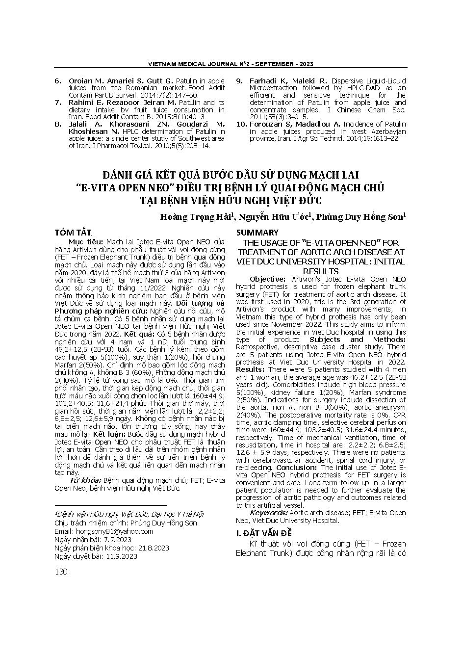 Đánh giá kết quả bước đầu sử dụng mạch lai "e-vita open neo" điều trị bệnh lý quai động mạch chủ tại bệnh viện hữu nghị việt đức = The usage of "e-vita open neo" for treatment of aortic arch disease at viet duc university hospital: initial results