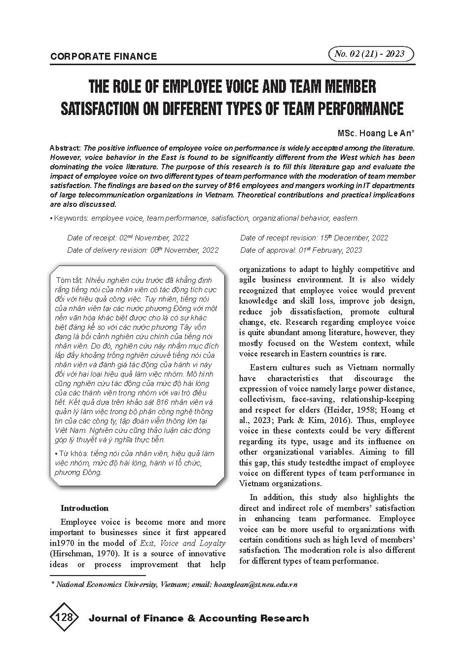 Vai trò về tiếng nói của nhân viên và sự hài lòng của thành viên nhóm đối với các loại hiệu suất khác nhau của nhóm = The role of employee voice and team member satisfaction on different types of team performance