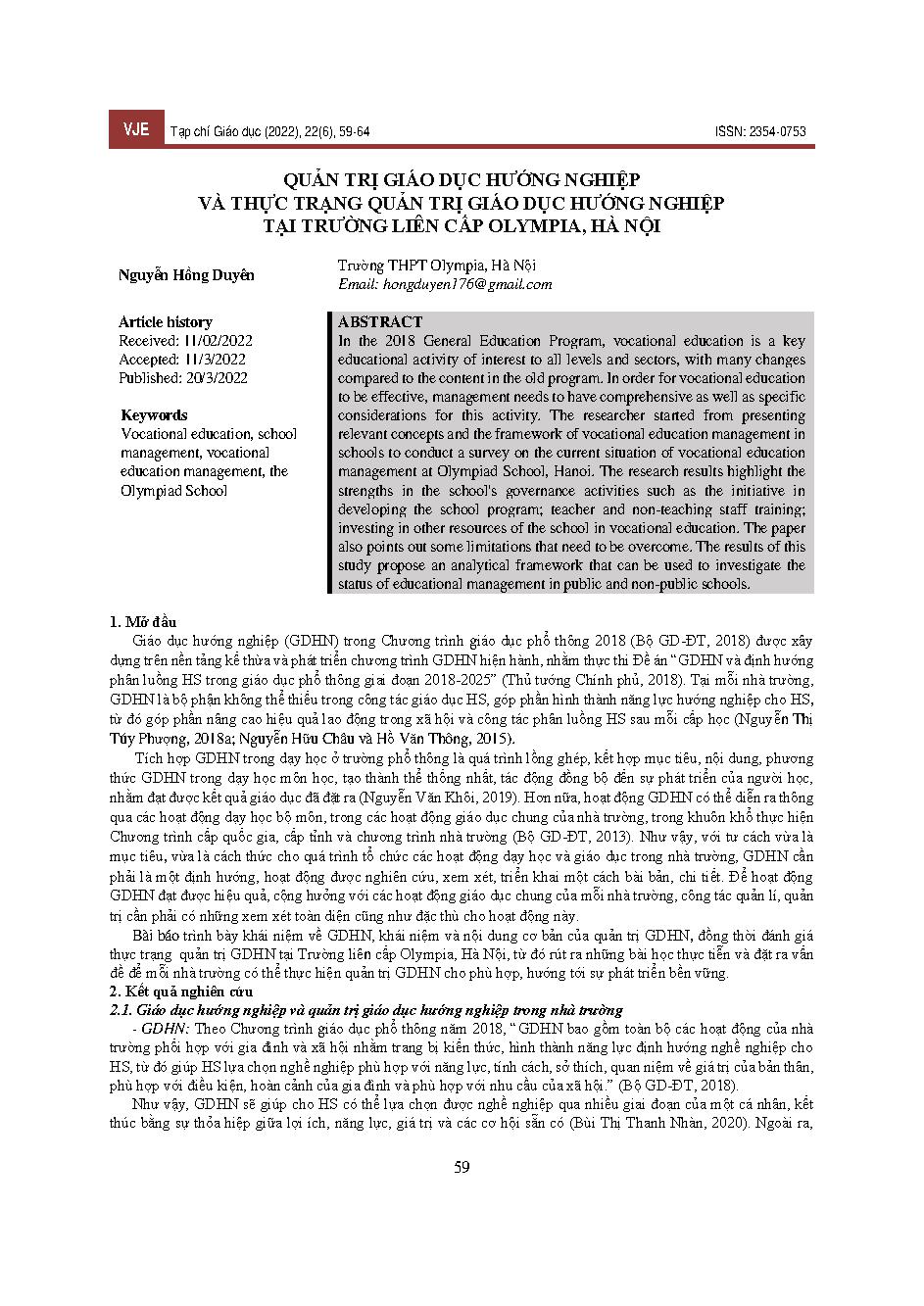 Quản trị giáo dục hướng nghiệp và thực trạng quản trị giáo dục hướng nghiệp tại trường liên cấp olympia, Hà Nội = Management of vocational education and the status of management of vocational education at the olympiad school, Hanoi