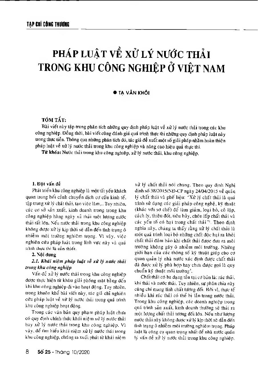 Pháp luật về xử lý nước thải trong khu công nghiệp ở Việt Nam = Laws on the treatement of wastewater in industrial zones