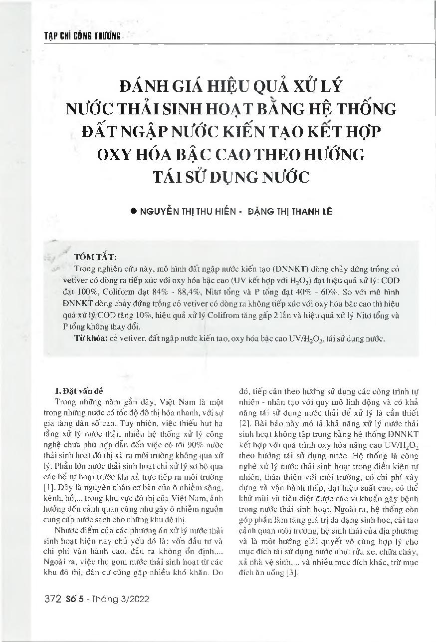 Đánh giá hiệu quả xử lý nước thải sinh hoạt bằng hệ thống đất ngập nước kiến tạo kết hợp oxy hóa bậc cao theo hướng tái sử dụng nước = Evaluating the domestic wastewater treatment efficiency of the vertical flow constructed wetland planted vetiver