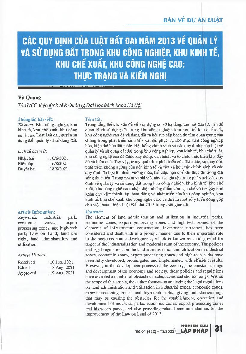 Các quy định của luật đất đai năm 2013 về quản lý và sử dụng đất trong khu công nghiệp, khu kinh tế, khu chế xuất, khu công nghệ cao: thực trạng và kiến nghị = Regulations of the 2013 land law on management and use of land in industrial parks, economic zo