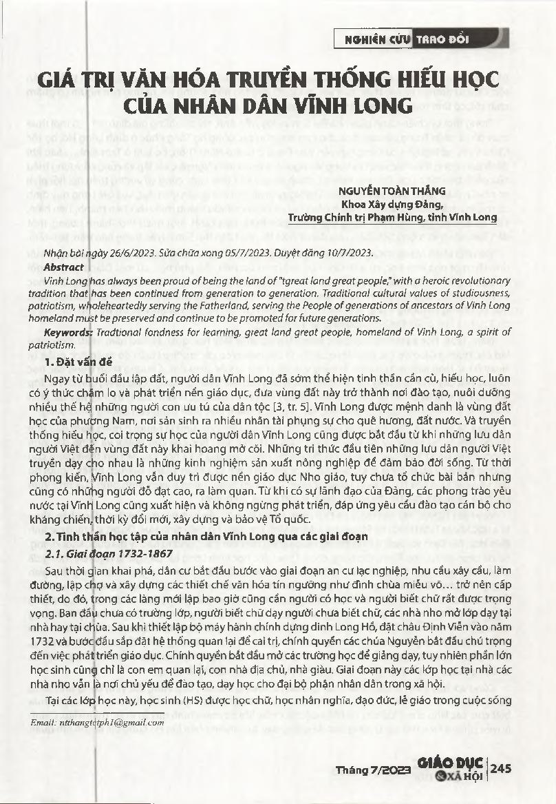 Giá trị văn hóa truyền thống hiếu học cùa nhân dân Vĩnh Long = Traditional culture and studious values of Vinh Long people