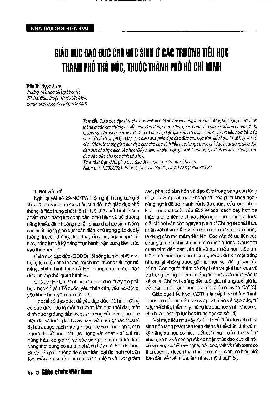 Giáo dục đạo đức cho học sinh ở các trường tiểu học thành phố Thủ Đức, thuộc thành phố Hồ Chí Minh = Ethical education for the students at the elementary schools in Thu Duc city, Ho Chi Minh City