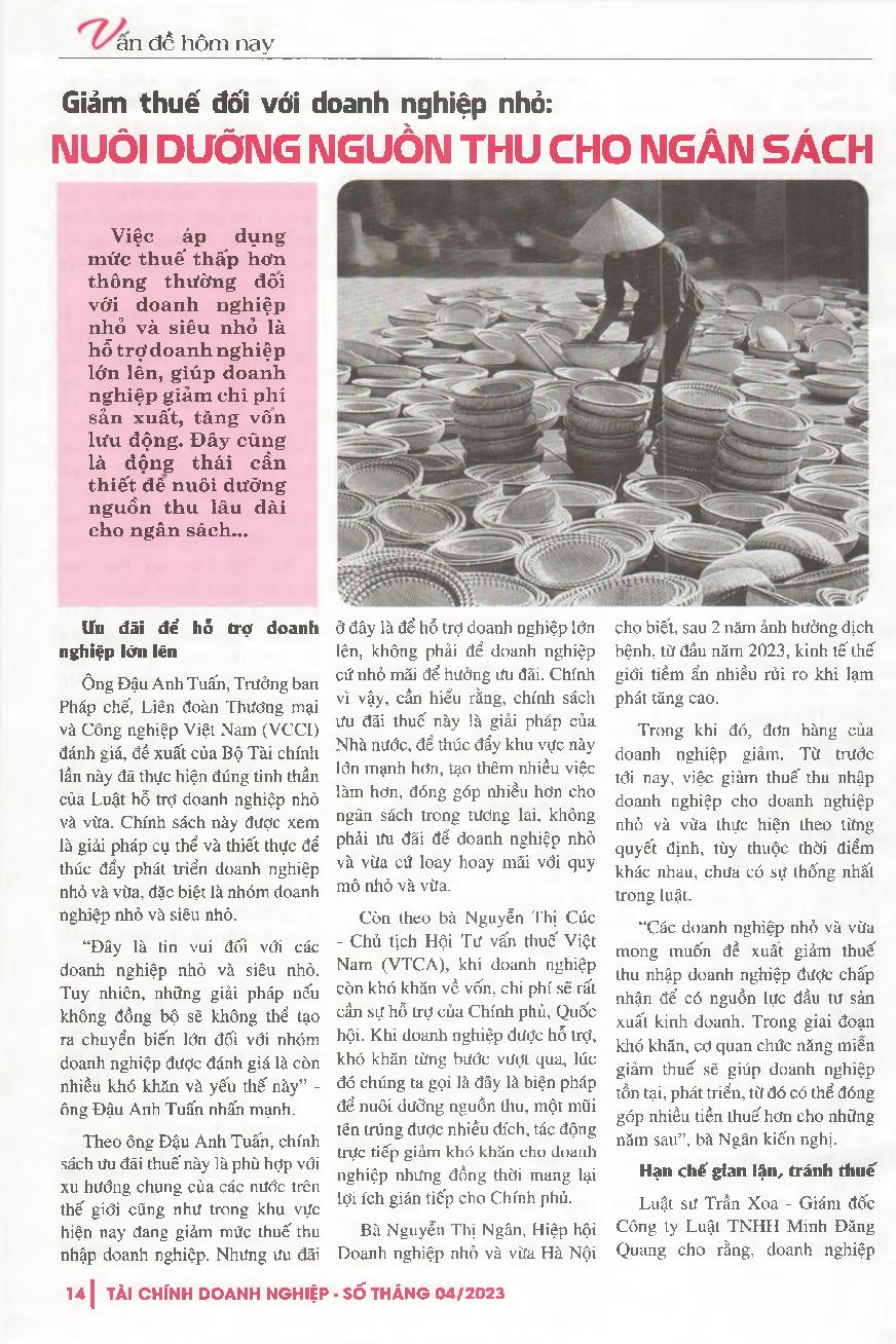 Giảm thuế đối với doanh nghiệp nhỏ: Nuôi dưỡng nguồn thu cho ngân sách = Tax reduction for small businesses: Nurturing revenue sources for the budget