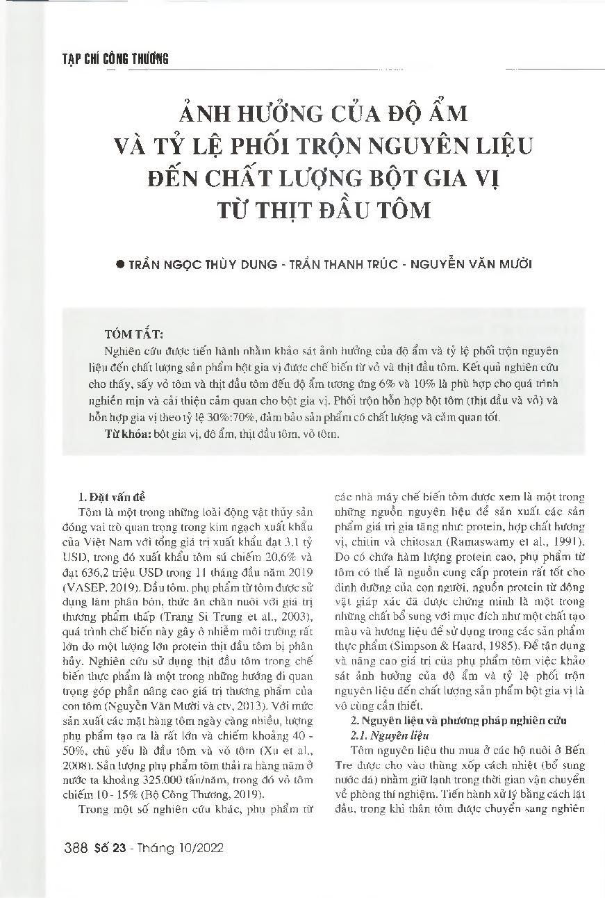 Ảnh hưởng của độ ẩm và tỷ lệ phối trộn nguyên liệu đến chất lượng bột gia vị từ thịt đầu tôm = Impacts of moisture content and mixing ratio of ingredients on the quality of seasoning powder made from shrimp shell and shrimp head meat