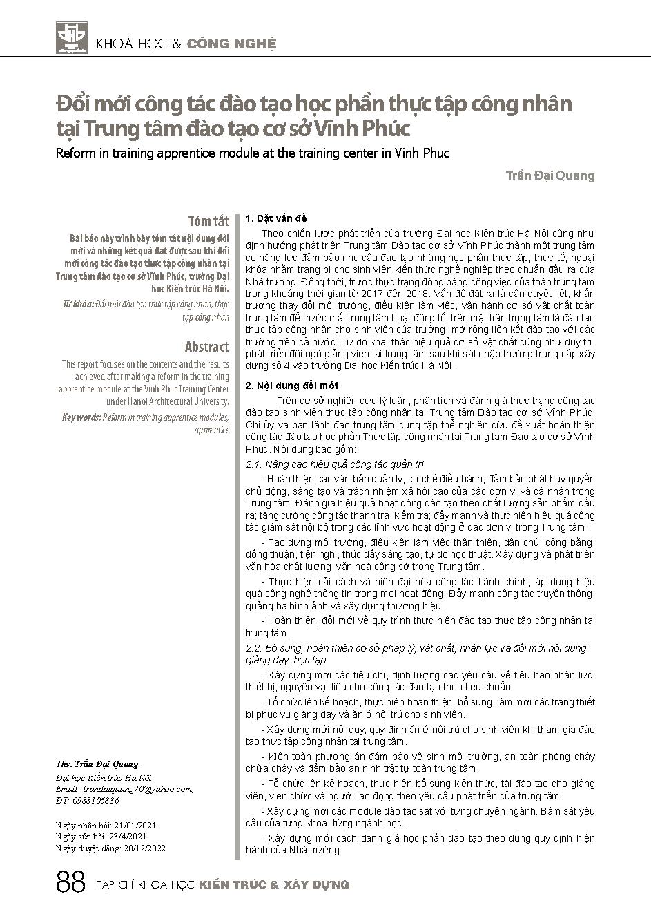 Đổi mới công tác đào tạo học phần thực tập công nhân tại Trung tâm đào tạo cơ sở Vĩnh Phúc = Reform in training apprentice module at the training center in Vinh Phuc