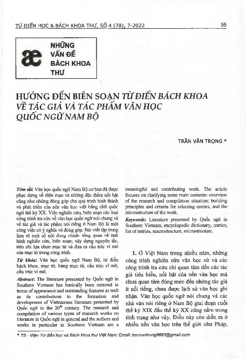 Hướng đến biên soạn Từ điển bách khoa về tác giả và tác phẩm văn học quốc ngữ Nam Bộ = Towards compiling an Encyclopedic Dictionary of authors and works written in Quốc ngữ in Southern Vietnam literature