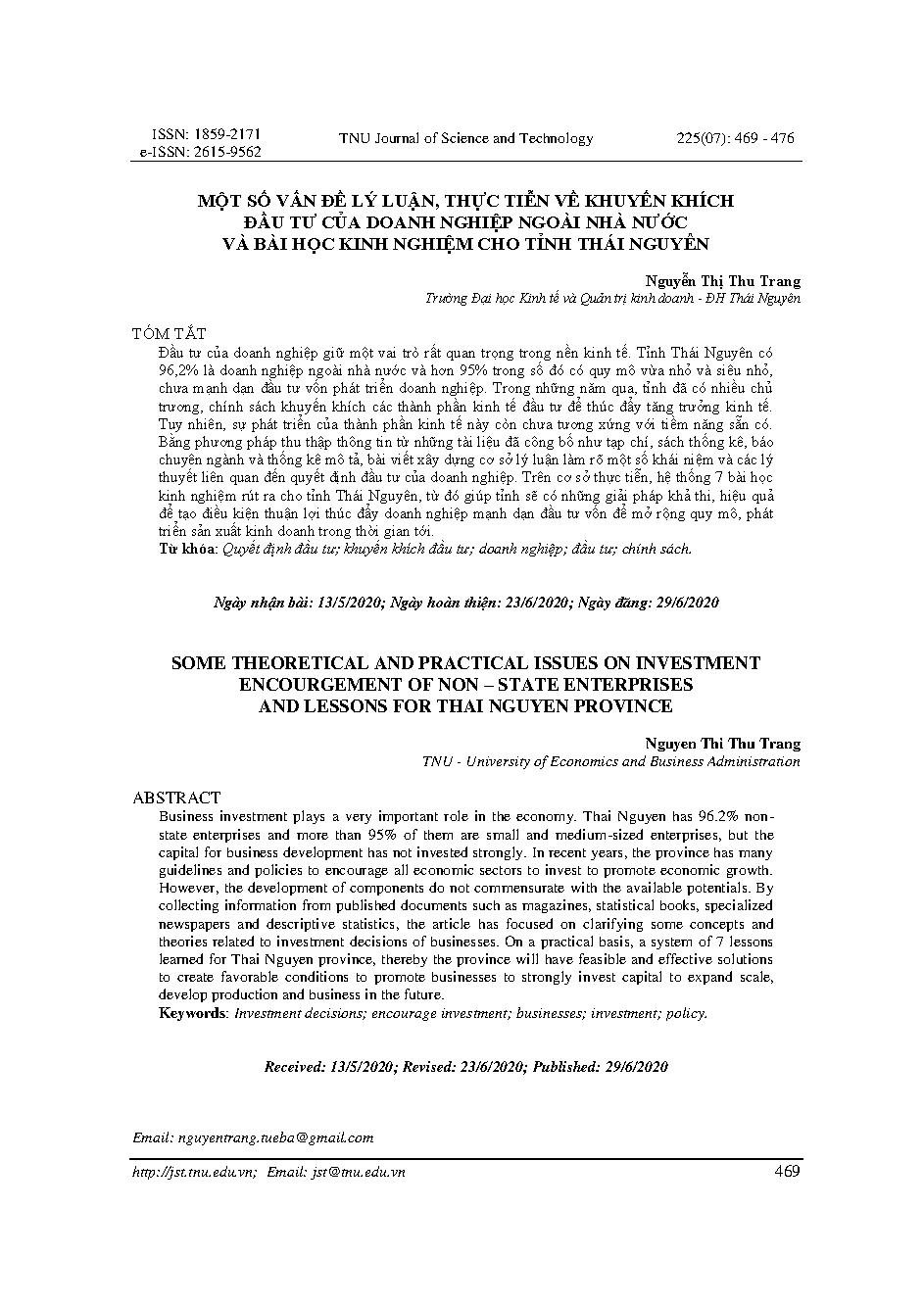 MỘT SỐ VẤN ĐỀ LÝ LUẬN, THỰC TIỄN VỀ KHUYẾN KHÍCH ĐẦU TƯ CỦA DOANH NGHIỆP NGÒAI NHÀ NƯỚC VÀ BÀI HỌC KINH NGHIỆM CHO TỈNH THÁI NGUYÊN = SOME THEORETICAL AND PRACTICAL ISSUES ON INVESTMENT ENCOURGEMENT OF NON – STATE ENTERPRISES AND LESSONS FOR THAI NGUYEN PROVINCE
