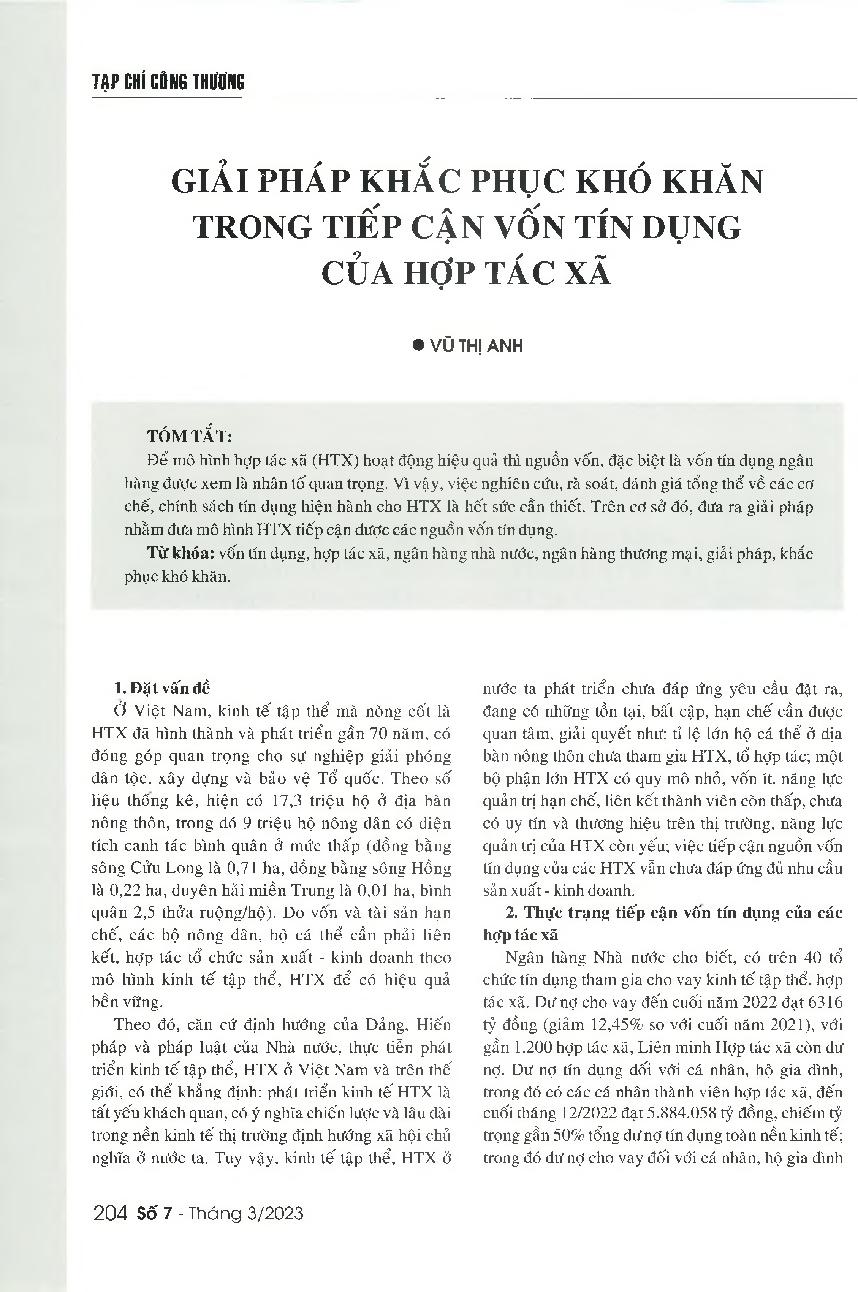 Giải pháp khắc phục khó khăn trong tiếp cận vốn tín dụng của hợp tác xã = Solutions to help cooperatives better access to the bank's credit source