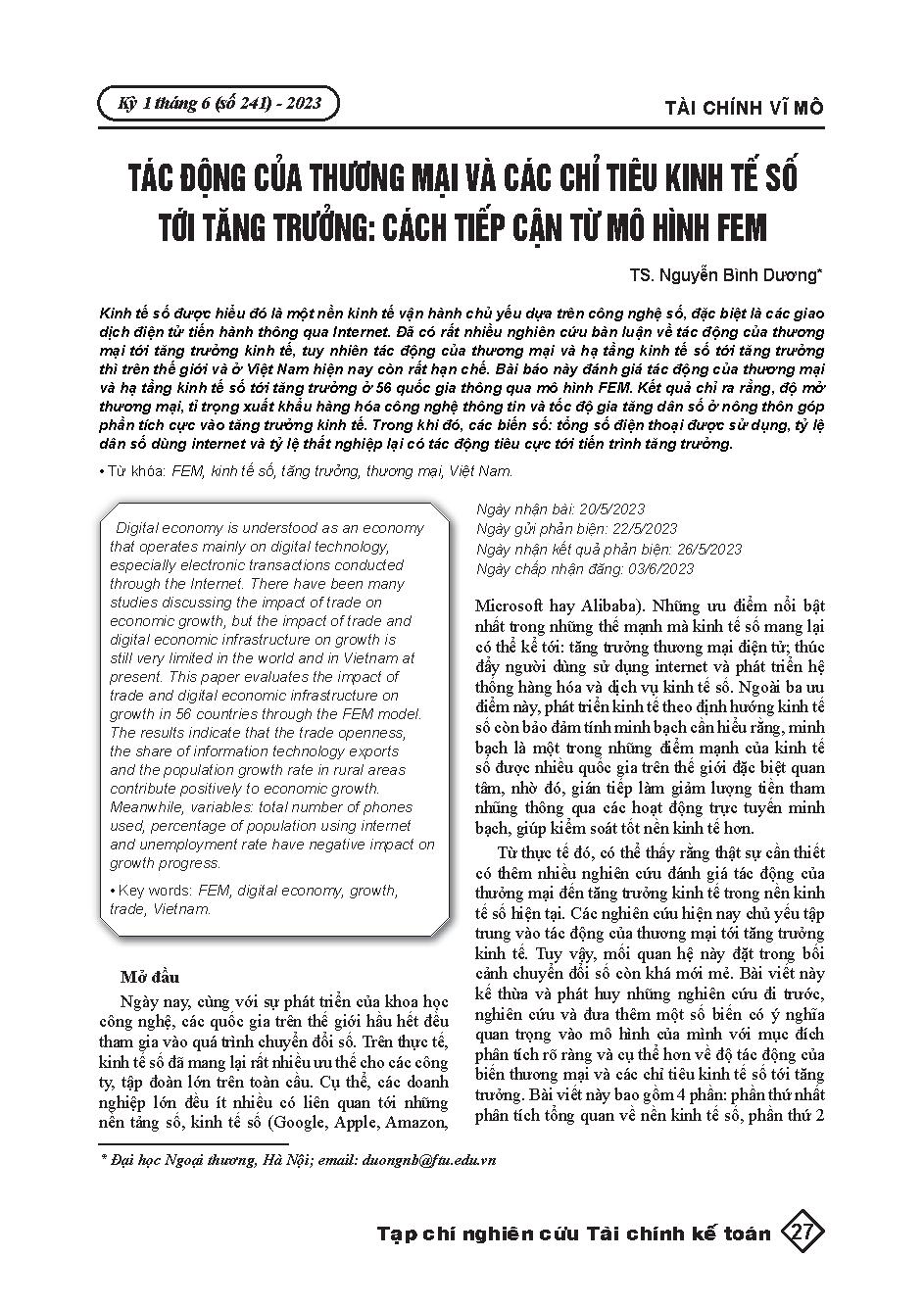 Tác động của thương mại và các chỉ tiêu kinh tế số tới tăng trưởng: Cách tiếp cận từ mô hình FEM = The impact of trade and digital economic indicators on growth: An approach from the FEM model