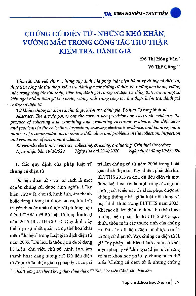 Chứng cứ điện tử - những khó khăn vướng mắc trong công tác thu thập, kiểm tra, đánh giá = Digital evidence - Difficulties and problems in its collection, inspection and evaluation