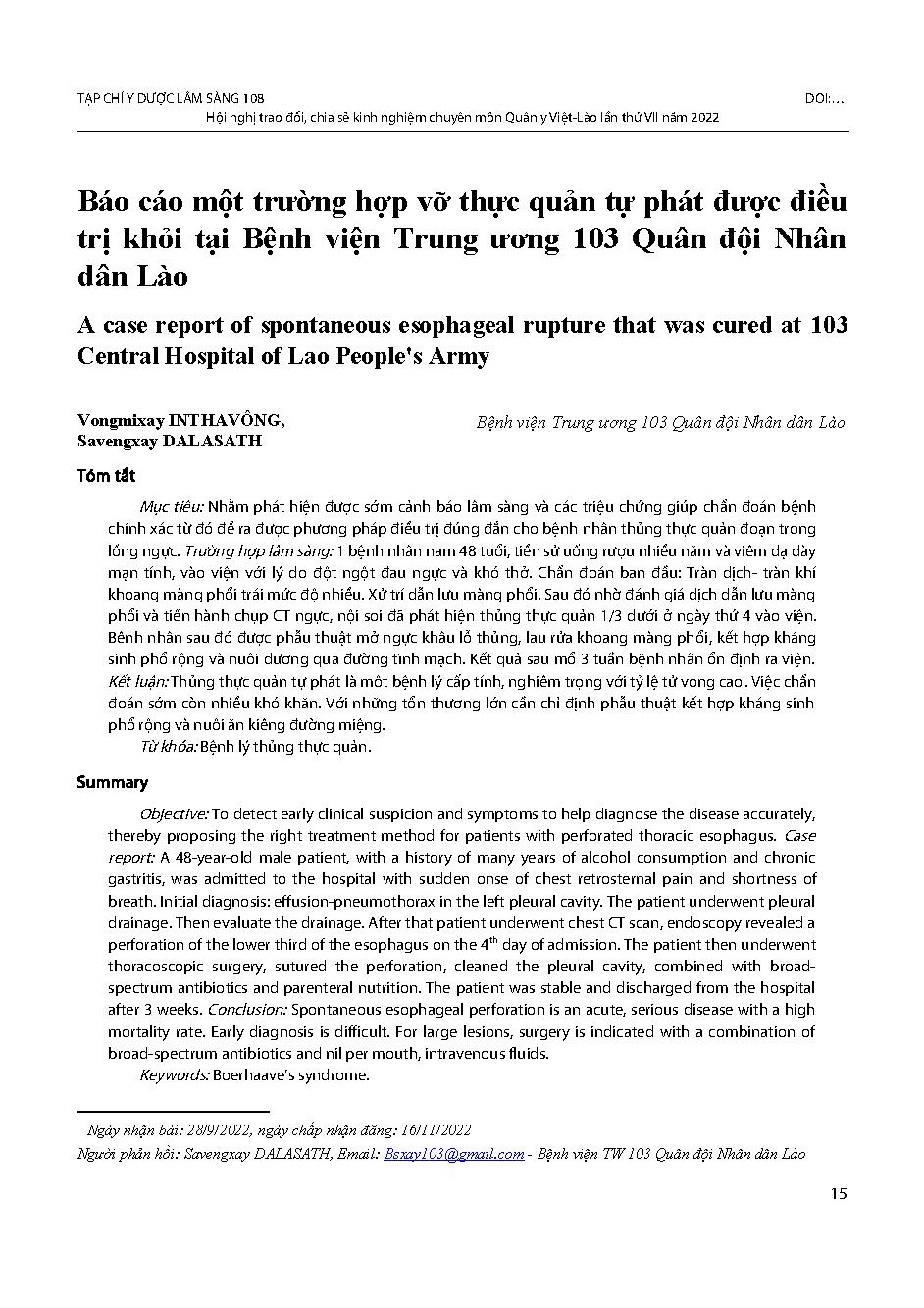 Báo cáo một trường hợp vỡ thực quản tự phát được điều trị khỏi tại Bệnh viện Trung ương 103 Quân đội Nhân dân Lào = A case report of spontaneous esophageal rupture that was cured at 103 Central Hospital of Lao People&; 39;s Army
