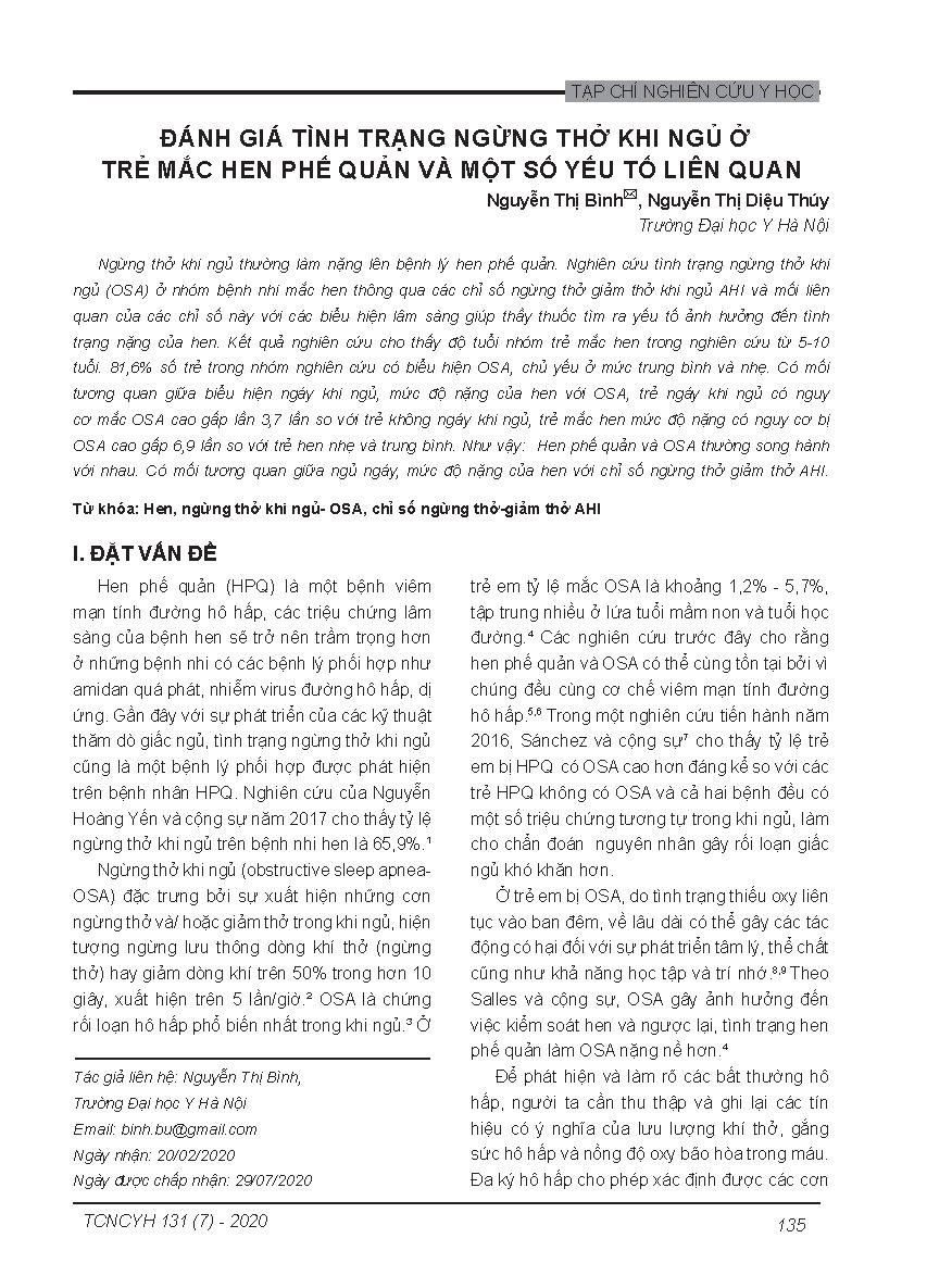 Đánh giá tình trạng ngừng thở khi ngủ ở trẻ mắc hen phế quản và một số yếu tố liên quan = Obstructive sleep apnea in children with asthma and associated risk factors