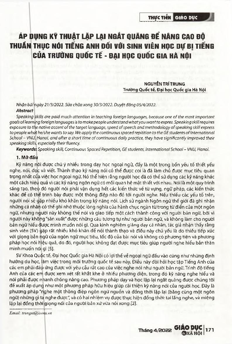 Áp dụng kỹ thuật lặp lại ngắt quãng để nâng cao độ thuần thục nói tiếng Anh đối với sinh viên học dự bị tiếng của Trường Quốc tế - Đại học Quốc gia Hà Nội = Application of continuous spaced repetition to enhance English speaking fluency among GE students