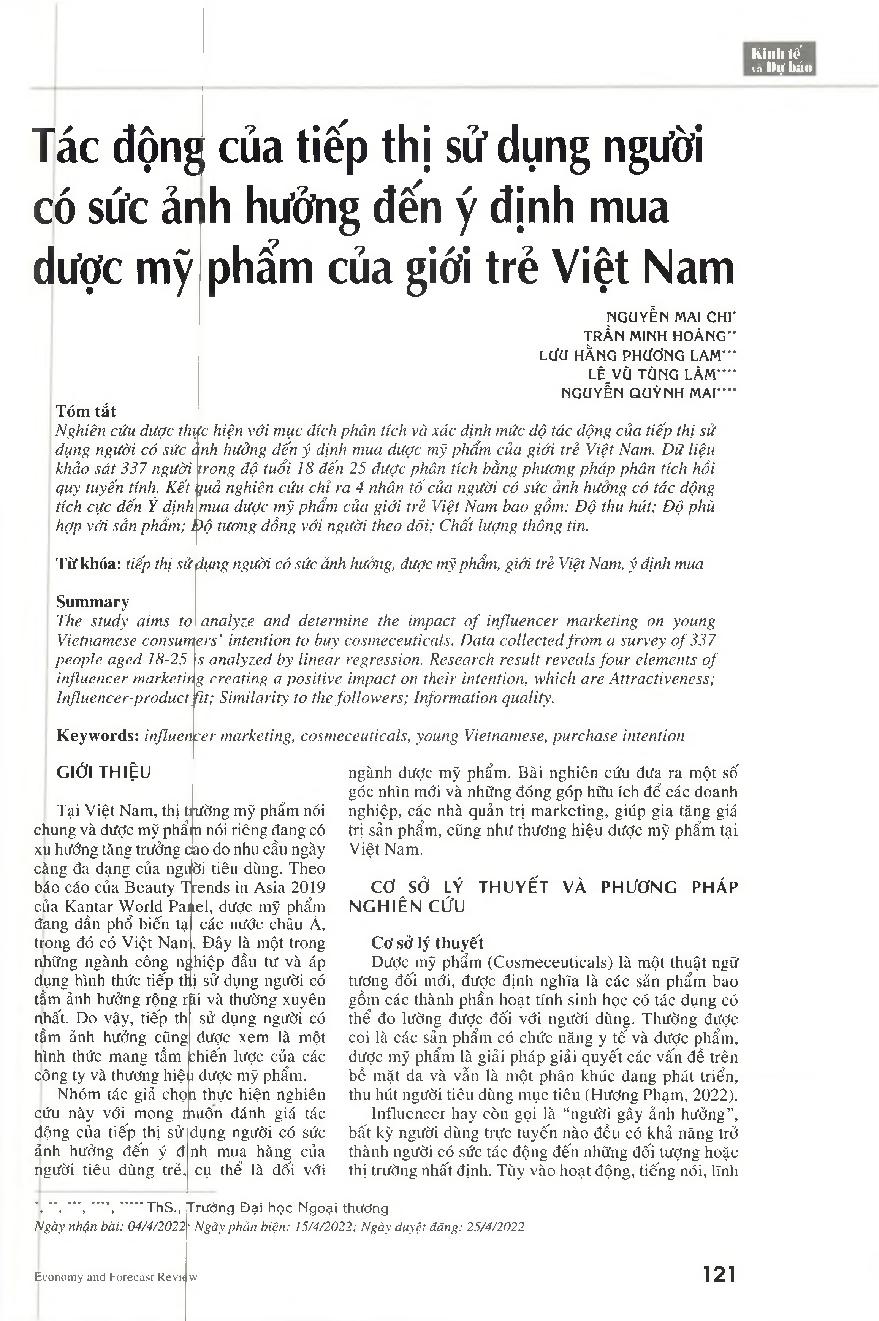 Tác động của tiếp thị sử dụng người có sức ảnh hưởng đến ý định mua dược mỹ phẩm của giới trẻ Việt Nam = Impact of influencer marketing on young Vietnamese consumers’ intention to buy cosmeceuticals