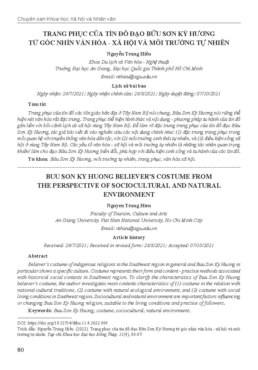 Trang phục của tín đồ đạo Bửu Sơn Kỳ Hương từ góc nhìn văn hóa – xã hội và môi trường tự nhiên = Buu Son Ky Huong believer&; 39;s costume from the perspective of sociocultural and natural environment