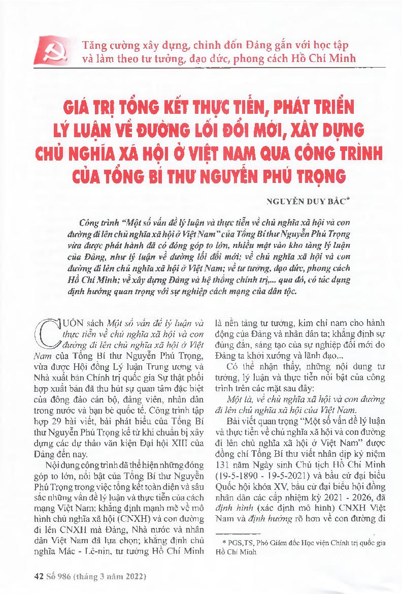 Giá trị tổng kết thực tiễn, phát triển lý luận về đường lối đổi mới, xây dựng chủ nghĩa xã hội ở Việt Nam qua công trình của Tổng Bí thư Nguyễn Phú Trọng = The value of summarizing practice, developing theory on the renovation and building socialism in Vi
