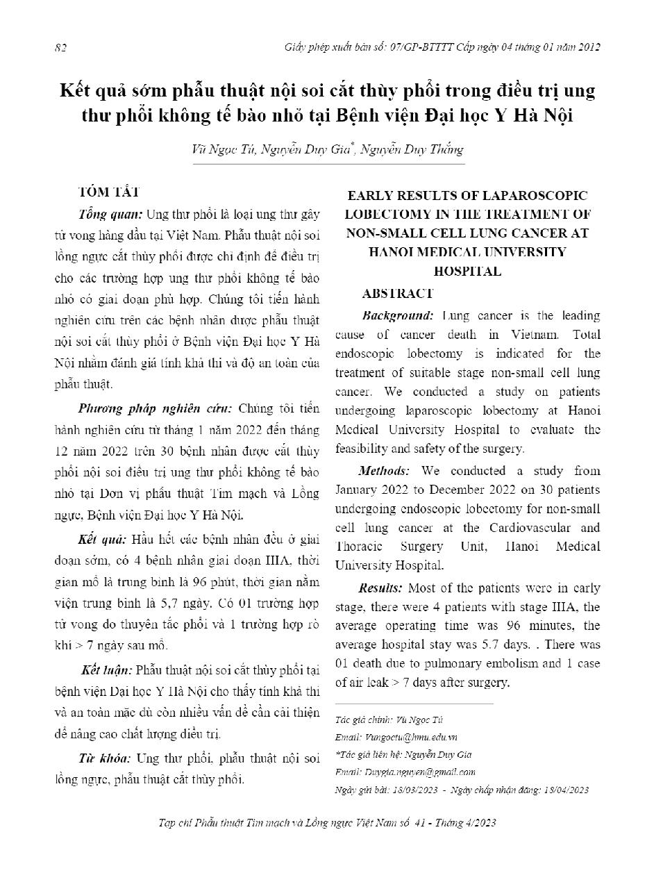 Kết quả sớm phẫu thuật nội soi cắt thùy phổi trong điều trị ung thư phổi không tế bào nhỏ tại Bệnh viện Đại học Y Hà Nội = Early results of laparoscopic lobectomy in the treatment of Non-small cell lung cancer at hanoi -medical university hospital