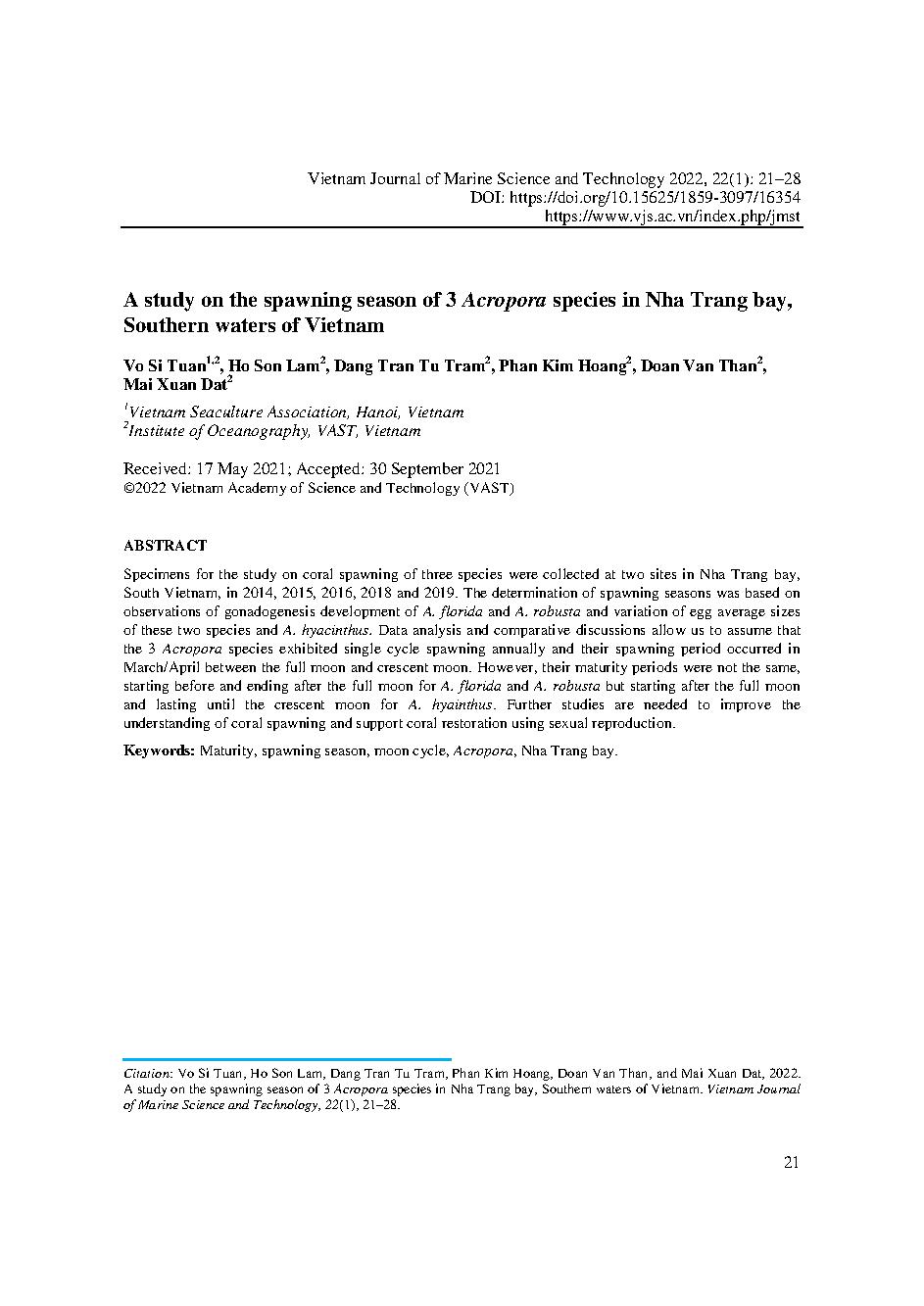 Nghiên cứu về mùa sinh sản của 3 loài Acropora ở vịnh Nha Trang, vùng biển phía Nam Việt Nam = A study on the spawning season of 3 Acropora species in Nha Trang bay, Southern waters of Vietnam