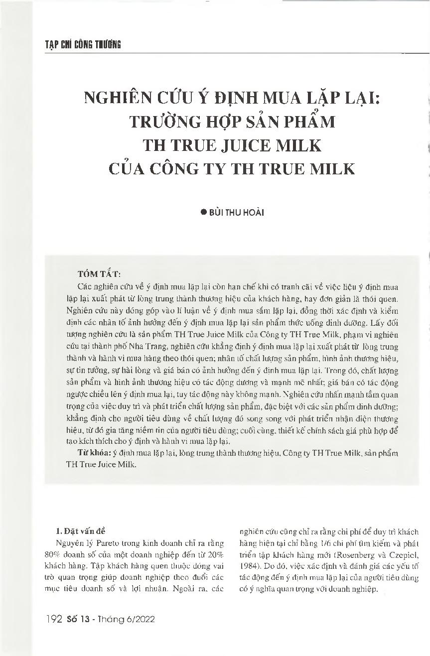Nghiên cứu ý định mua lặp lại - Trường hợp sản phẩm TH True Juice Milk của công ty TH True Milk = A study on the repurchase intention: Case study of TH True Juice Milk
