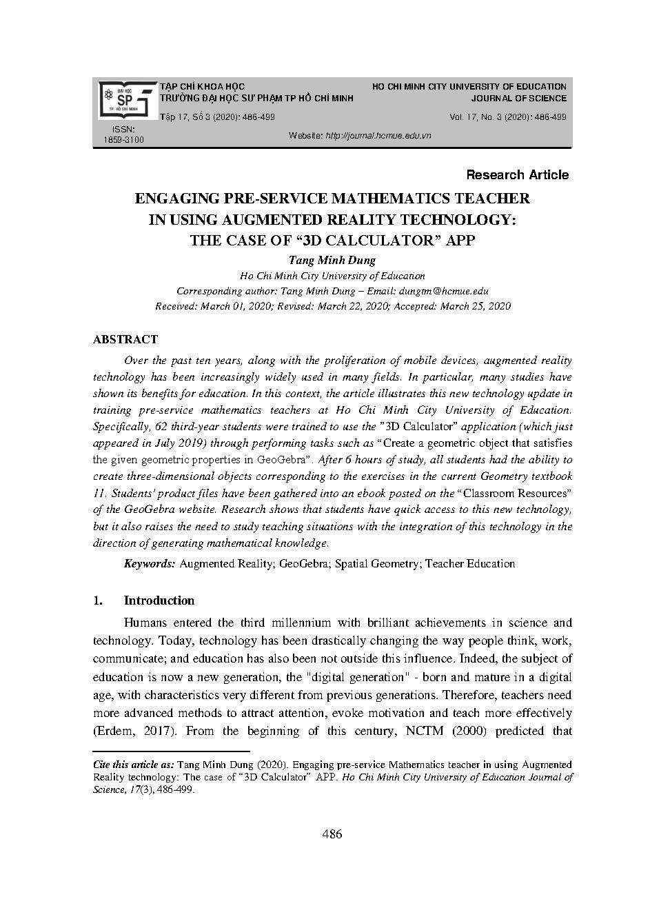Đào tạo sinh viên sư phạm toán sử dụng công nghệ thực tại ảo tăng cường: Trường hợp ứng dụng "3D Calculator" = Engaging pre-service mathematics teacher in using augmented reality technology: the case of “3D calculator” app