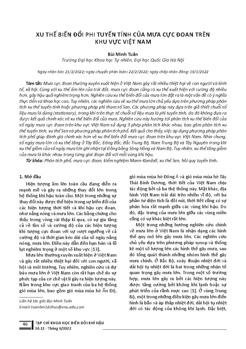 Xu thế biến đổi phi tuyến tính của mưa cực đoan trên khu vực Việt Nam = Non-linear trend in time series of heavy rainfall in Vietnam