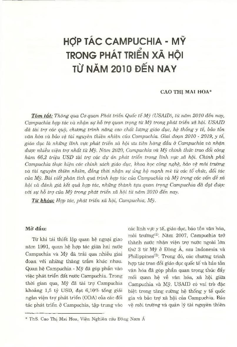 Hợp tác Campuchia - Mỹ trong phát triển xã hội từ năm 2010 đến nay = Cambodia - US Cooperation in Social Development since 2010