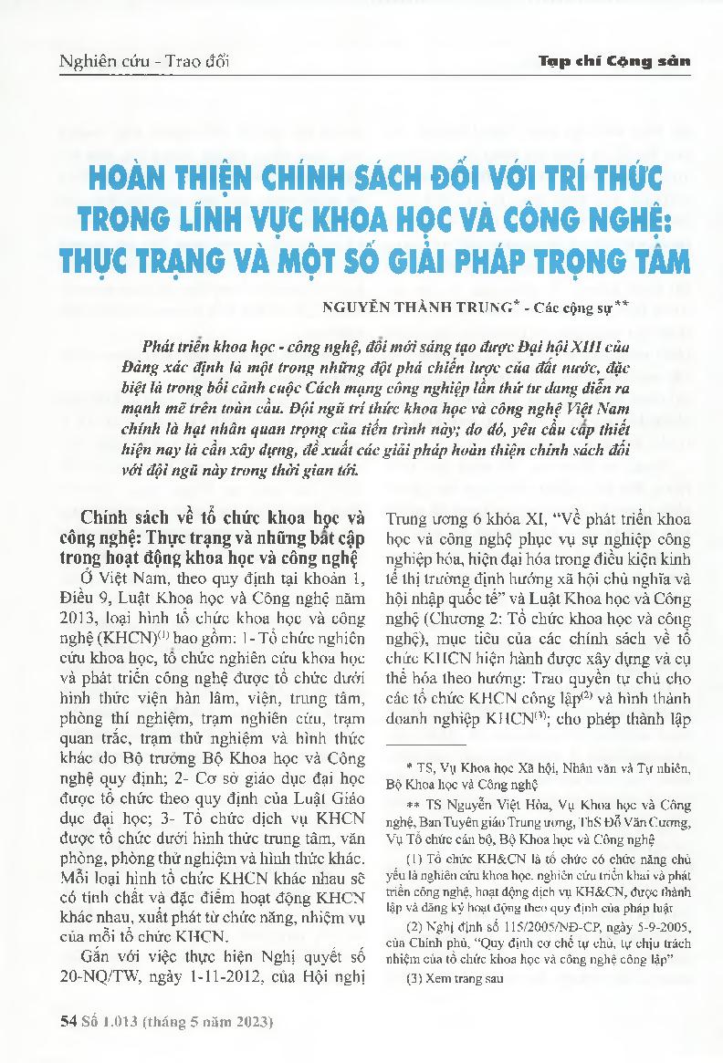 Hoàn thiện chính sách đối với trí thức trong lĩnh vực khoa học và công nghệ: Thực trạng và một số giải pháp trọng tâm