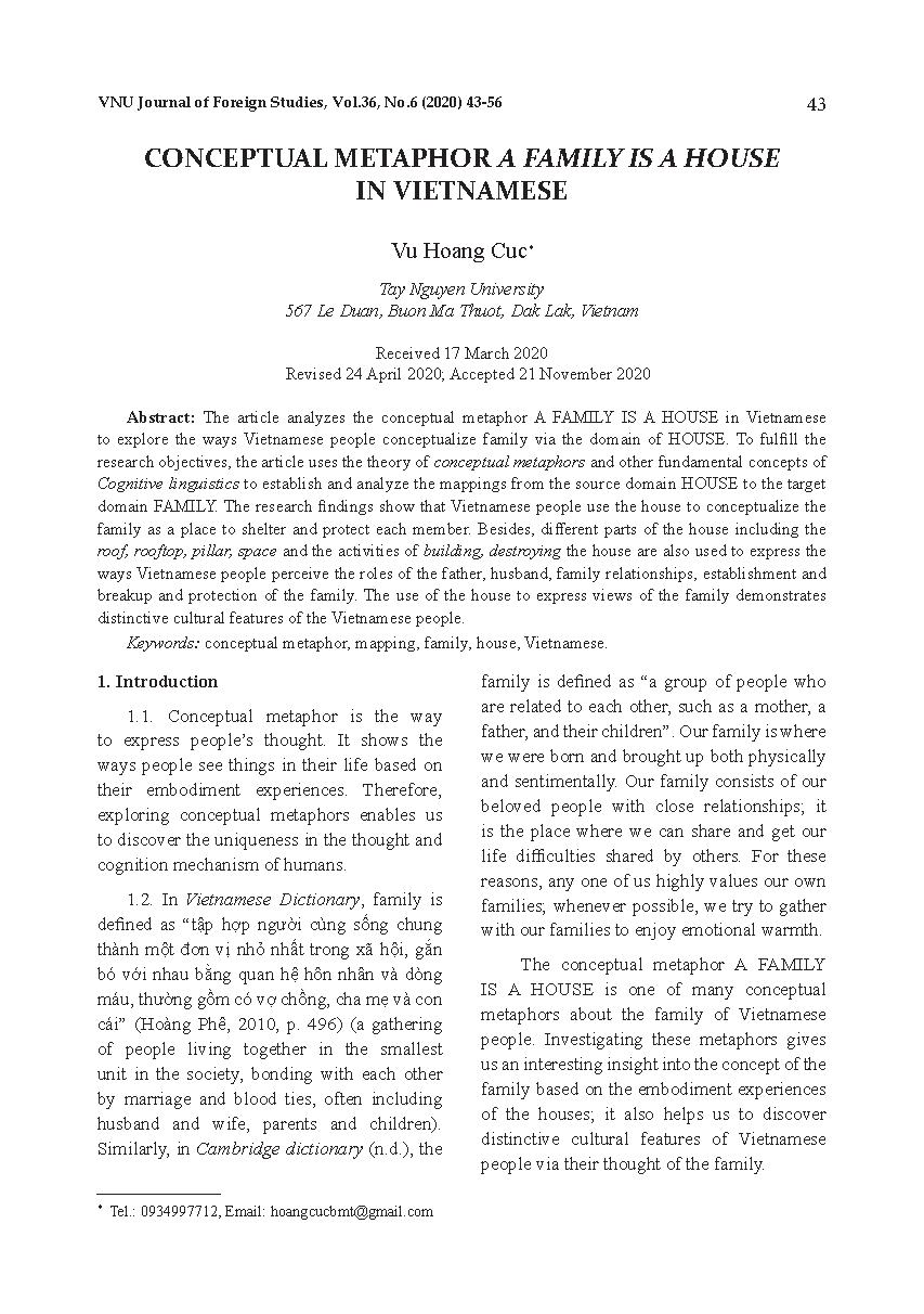 Ẩn dụ ý niệm gia đình là ngôi nhà trong tiếng Việt = Conceptual metaphor a family is a house in Vietnamese