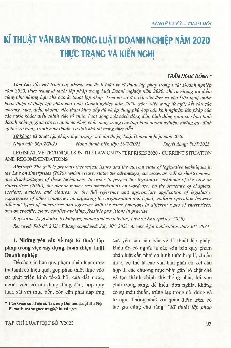 Kĩ thuật văn bản trong Luật Doanh nghiệp năm 2020 - Thực trạng và kiến nghị = Legislative techniques in the Law on Enterprises 2020 - Current situation and recommendations