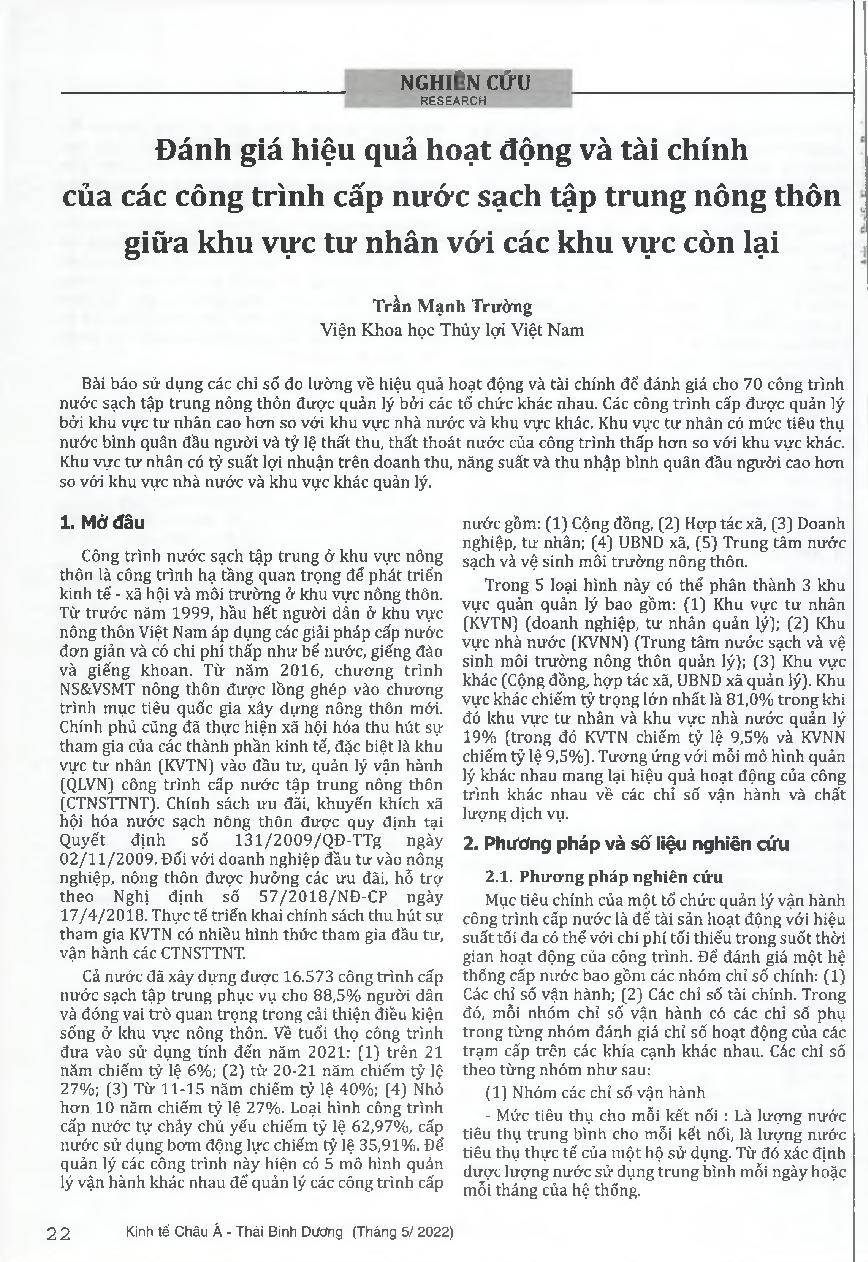 Đánh giá hiệu quả hoạt động và tài chính của các công trình cấp nước sạch tập trung nông thôn giữa khu vực tư nhân với các khu vực còn lại