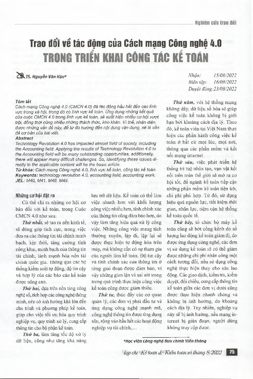 Trao đổi về tác động của Cách mạng Công nghệ 4.0 trong triển khai công tác kế toán = Discussing the impact of technology revolution 4.0 on the impiementation of accounting work