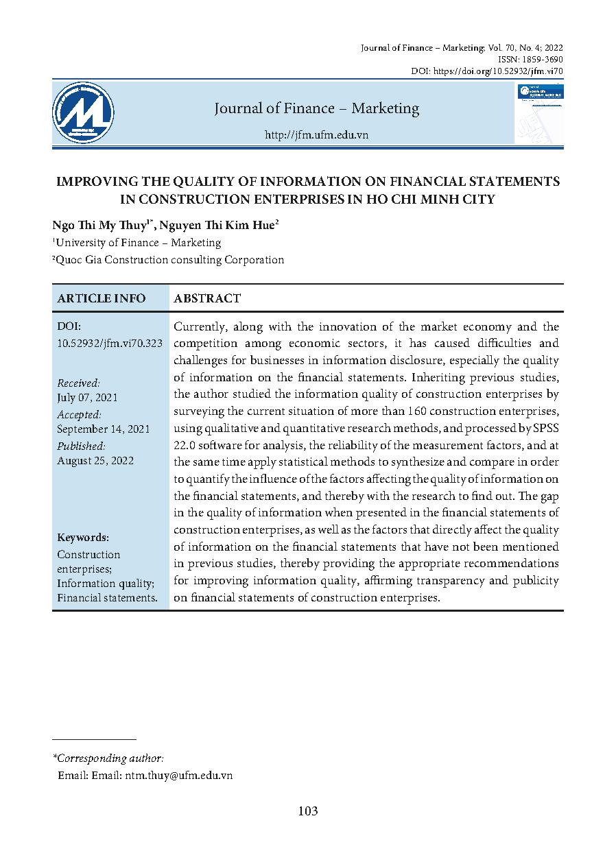 Nâng cao chất lượng thông tin kế toán trên báo cáo tài chính các doanh nghiệp xây lắp trên địa bàn Thành phố Hồ Chí Minh = Improving the quality of information on financial statements in construction enterprises in Ho Chi Minh city