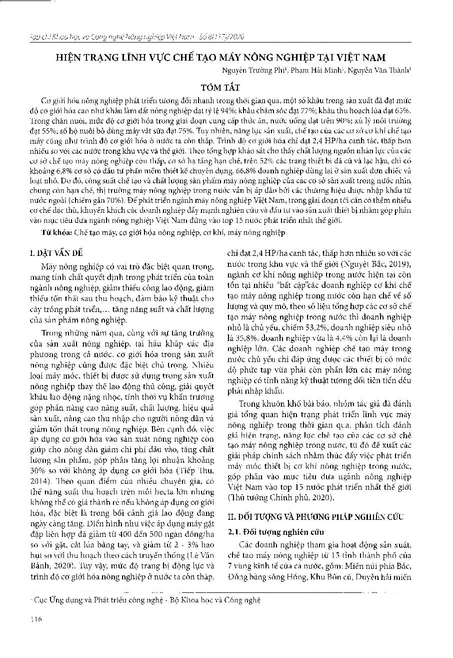 Hiện trạng lĩnh vực chế tạo máy nông nghiệp tại Việt Nam = Current status of manufacturing agricultural machines in Vietnam