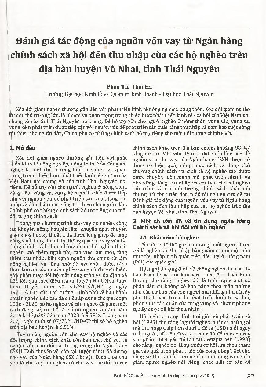 Đánh giá tác động của nguồn vốn vay từ ngân hàng chính sách xã hội đến thu nhập của các hộ nghèo trên địa bàn huyện Võ Nhai, tỉnh Thái Nguyên