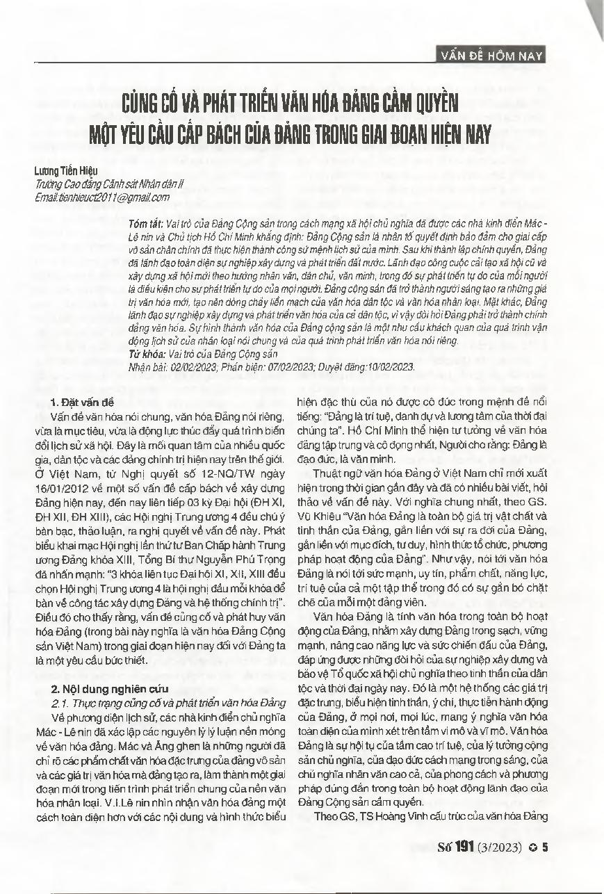Củng cố và phát triển văn hóa Đảng cầm quyền một yêu cầu cấp bách của Đảng trong giai hoạn hiện nay = Consolidating and developing the ruling Party's culture - An urgent requirement of our Party in the current period