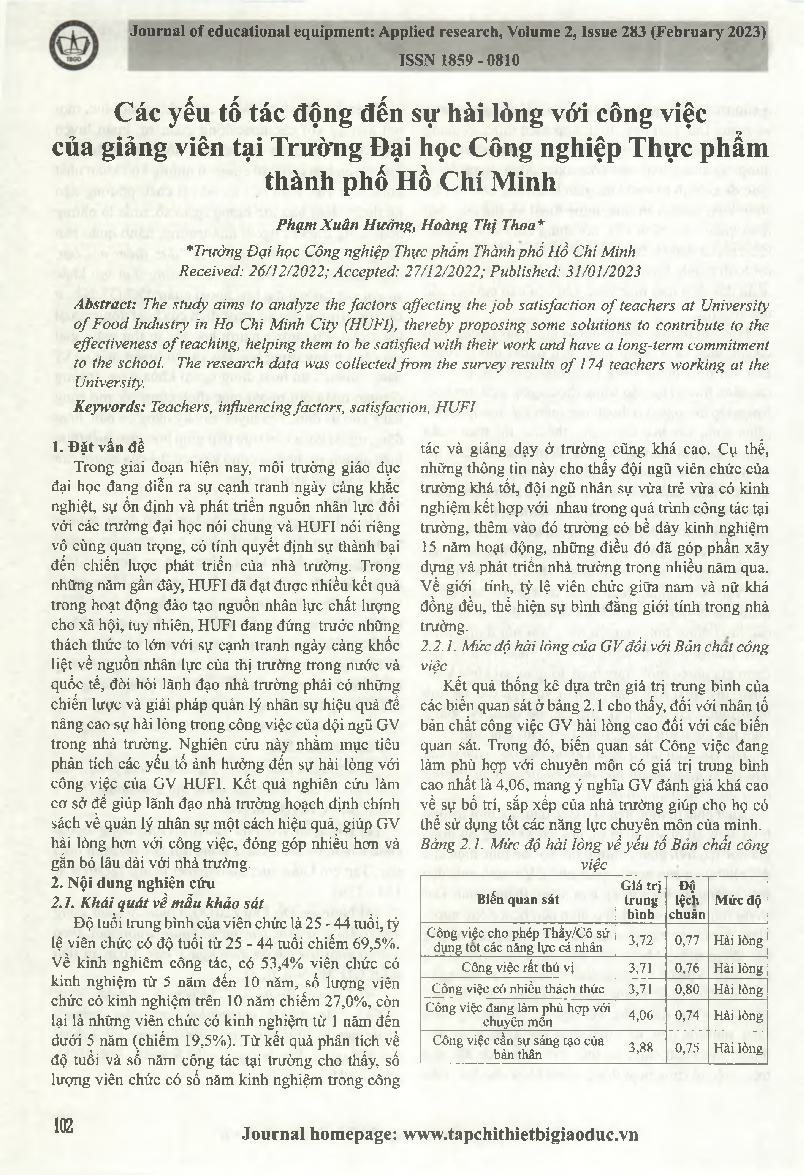 Các yếu tố tác động đến sự hài lòng với công việc của giảng viên tại Trường Đại học Công nghiệp Thực phẩm thành phố Hồ Chí Minh = Factors affecting job satisfaction of lecturers at Ho Chi Minh City University of Food Industry