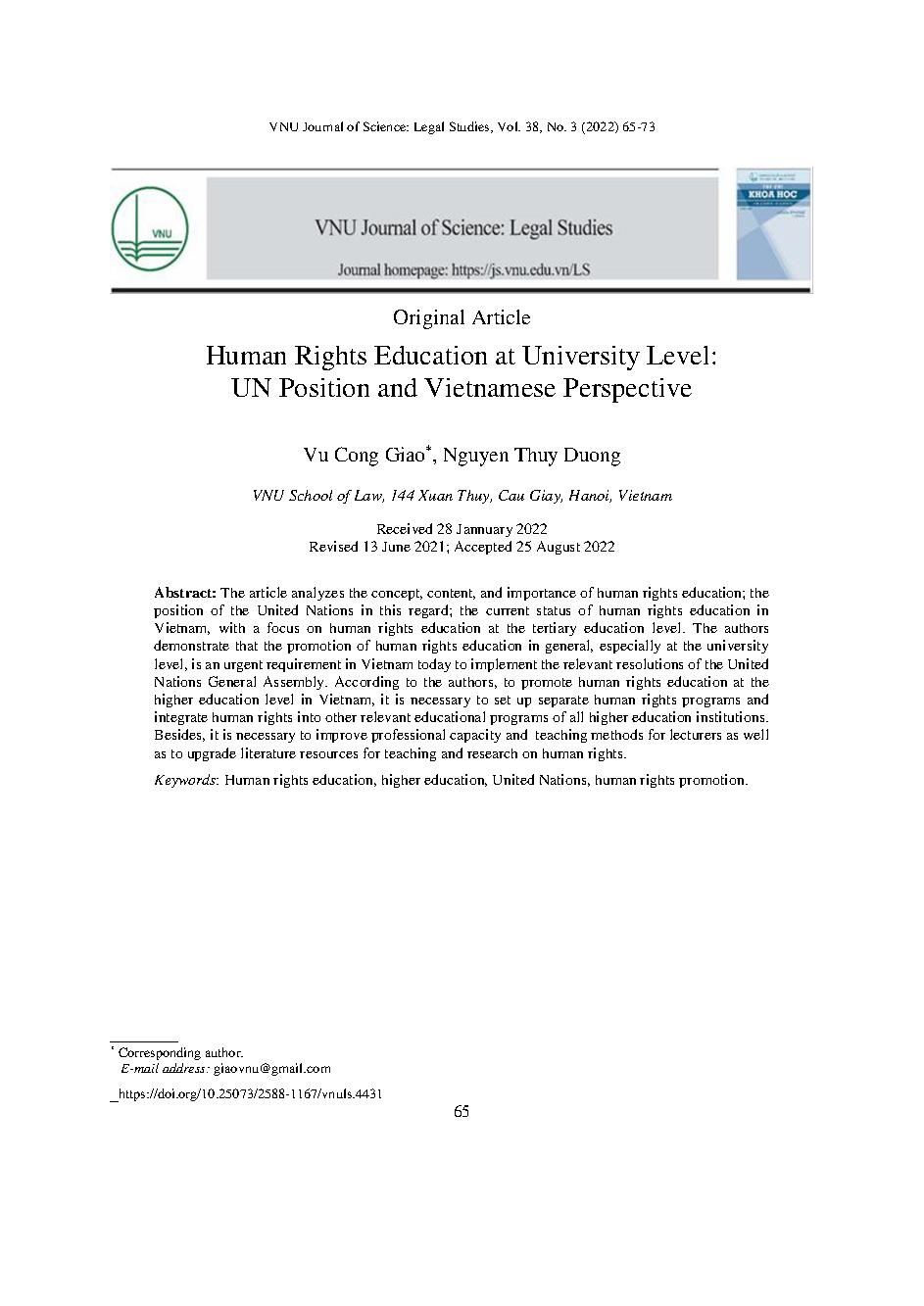 Giáo dục quyền con người ở bậc đại học: Quan điểm của Liên Hợp quốc và thực tiễn ở Việt Nam = Human rights education at university level: UN position and Vietnamese perspective