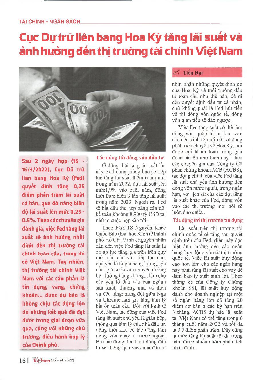 Cục Dự trữ liên bang Hoa Kỳ tăng lãi suất và ảnh hưởng đến thị trường tài chính Việt Nam = US Federal Reserve raises interest rates and affects Vietnam&; 39;s financial market