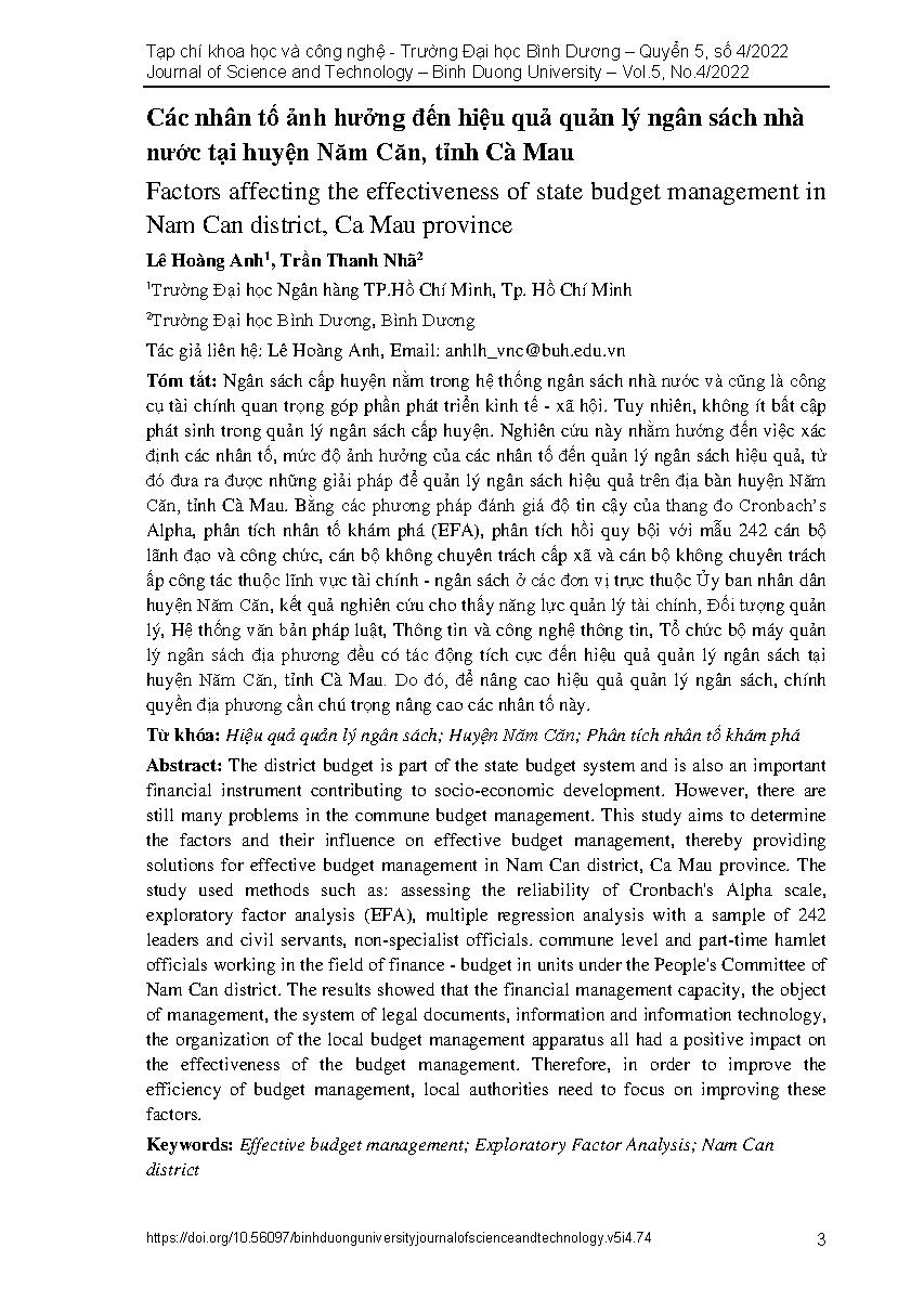 Các nhân tố ảnh hưởng đến hiệu quả quản lý ngân sách nhà nước tại huyện Năm Căn, tỉnh Cà Mau = Factors affecting the effectiveness of state budget management in Nam Can district, Ca Mau province