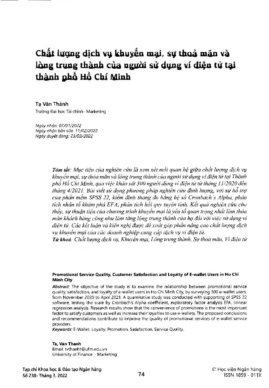 Chất lượng dịch vụ khuyến mại, sự thỏa mãn và lòng trung thành của người sử dụng ví điện tử tại thành phố Hồ Chí Minh = Promotional Service Quality, Customer Satisfaction and Loyalty of E-wallet Users in Ho Chi Minh City